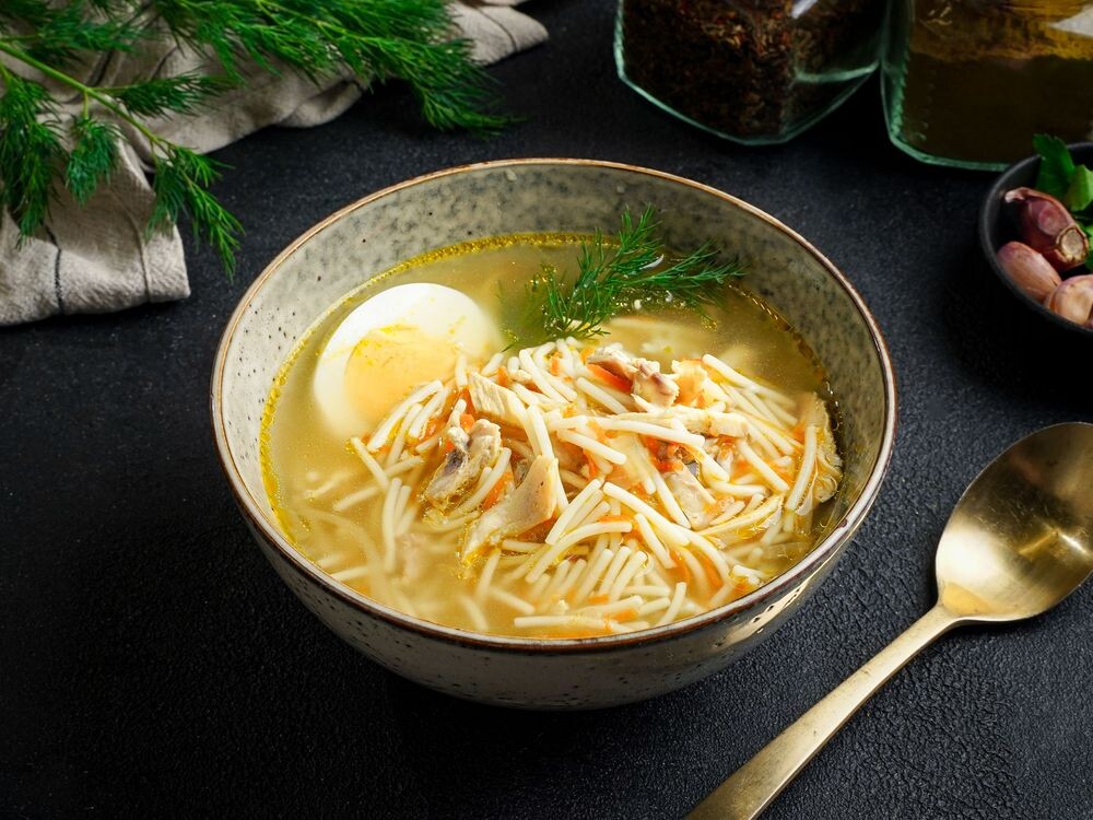 Бульон с нежным куриным филе, домашней лапшой, морковью, луком и зеленью: половинка яйца