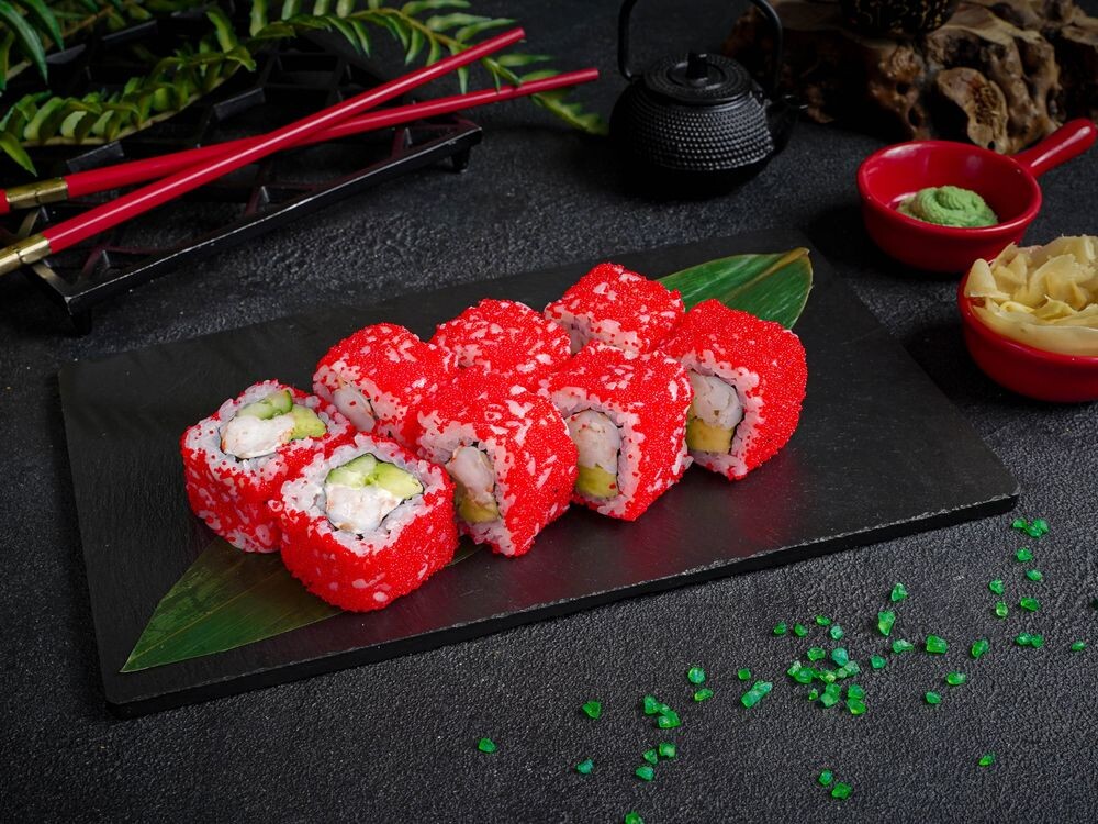 Снежный краб, рис, огурец сливочный сыр, икра тобико