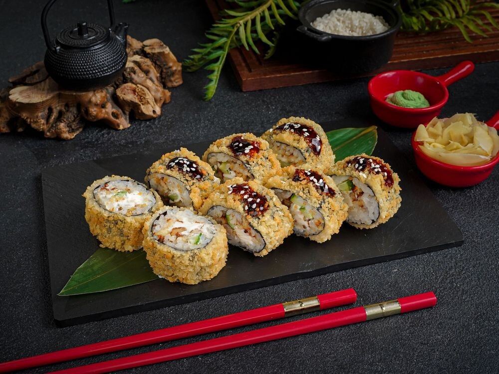 Угорь, рис, оругец сливочный сыр, хрустящие сухари панко