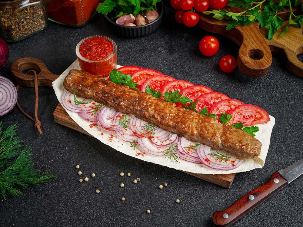 Кебаб из баранины, лаваш, помидор, лук красный , томатный соус