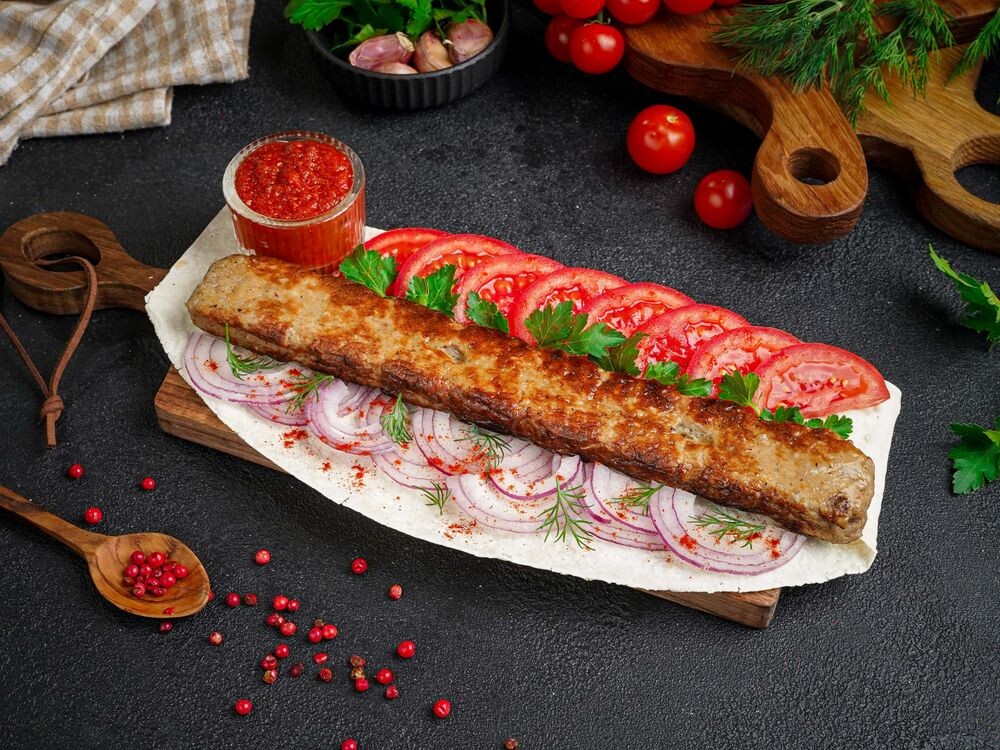 Кебаб из курицы, лаваш, помидор, лук красный , томатный соус