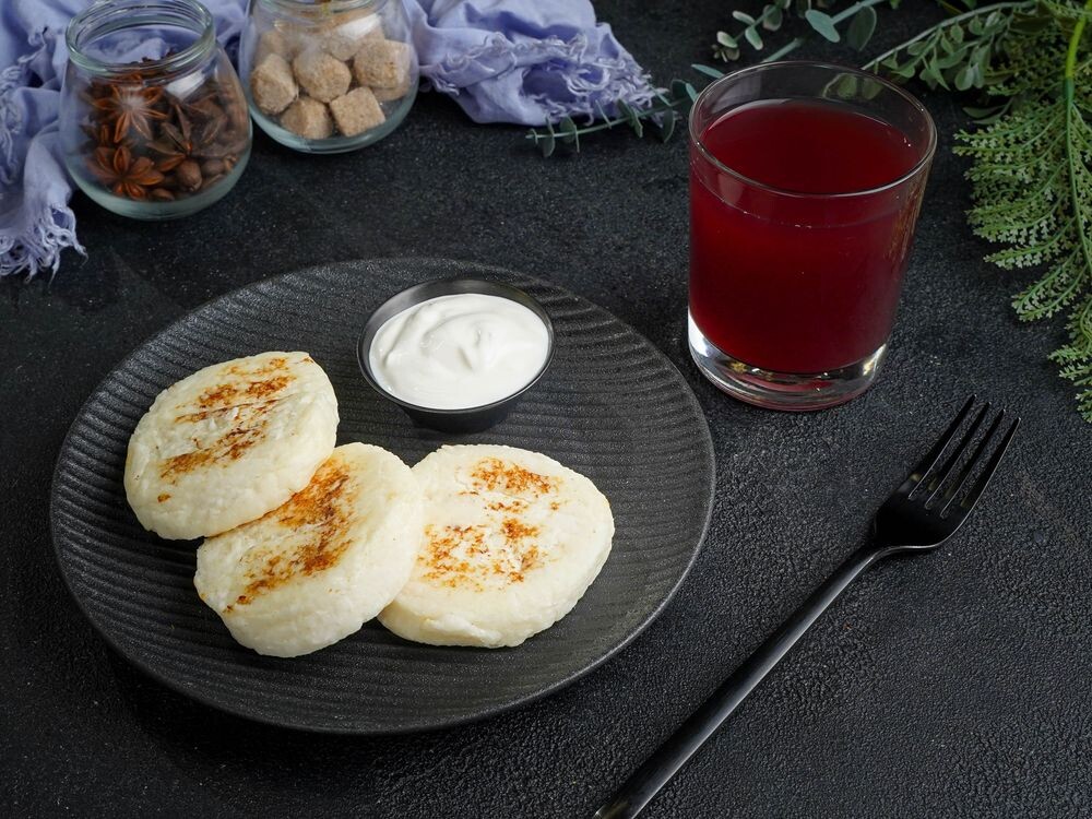 Сырники 3 шт,малиновый джем, сметана, сгущенка морс ягодный