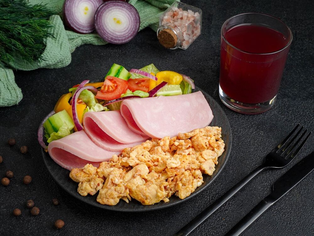 Омлет, ветчина, салат овощной, морс ягодный, хлеб белый,хлеб черный