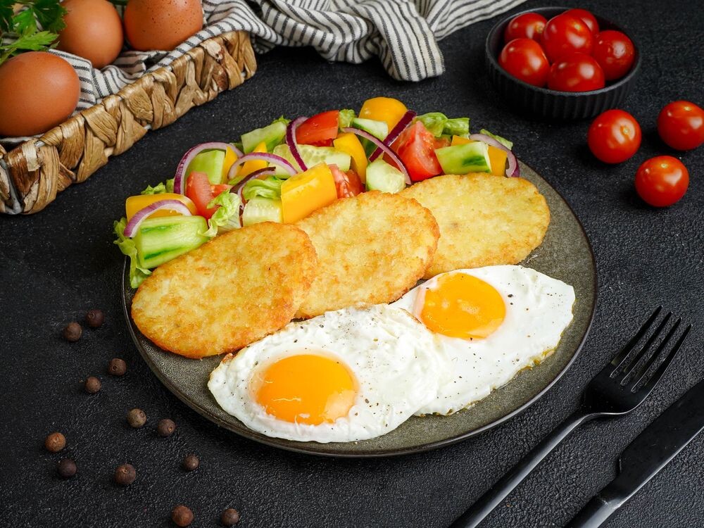 Яичница глазунья, хашбраун, салат овощной, морс ягодный, хлеб белый,хлеб черный