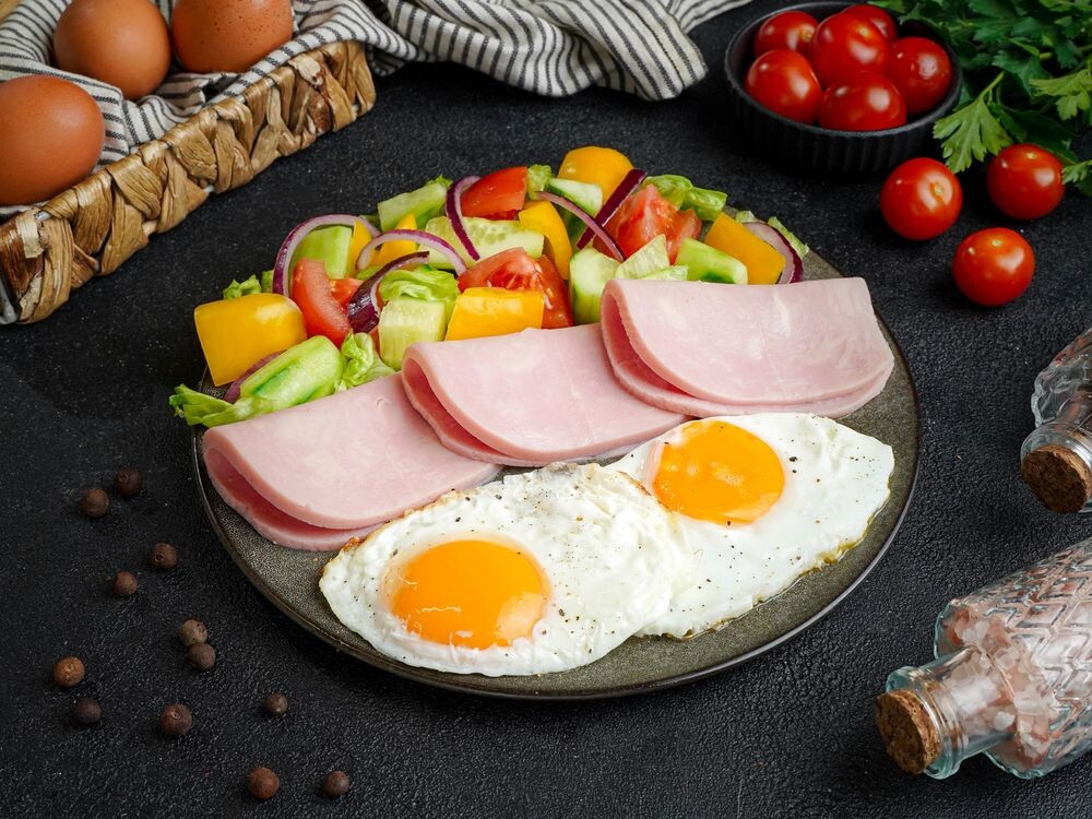 Яичница глазунья, вечина, салат овощной, морс ягодный, хлеб белый,хлеб черный