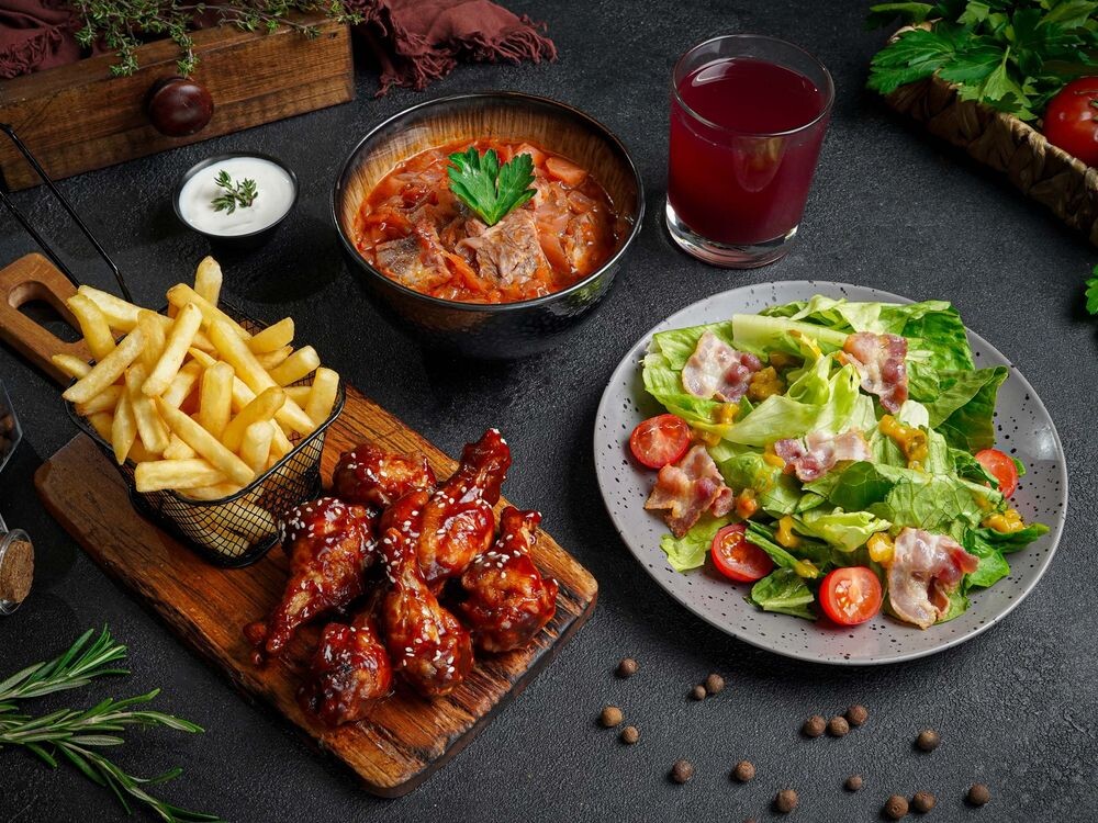 Борщ ,Крылья BBq с картофелем фри ,салат с беконом , морс на выбор, черный и белый хлеб