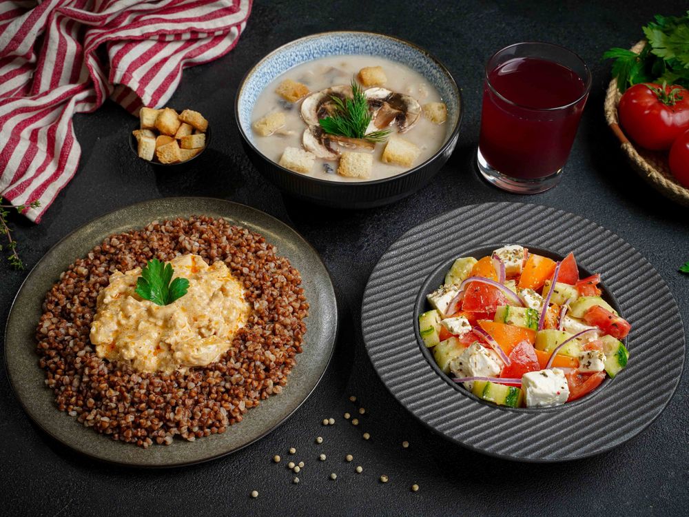 Грибной суп пюое ,фирменная курица по грузински в сливочном соусе с гречкой ,греческий салат , морс на выбор, черный и белый хлеб