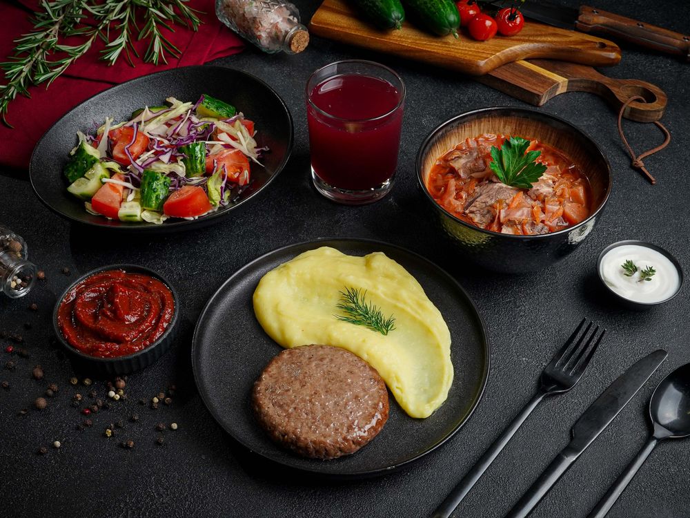 Борщ с говядиной и сметаной , котлета из говядины Primebeef с картофельным пюре, салат из свежих овощей, фирменный красный соус, черный и белый хлеб