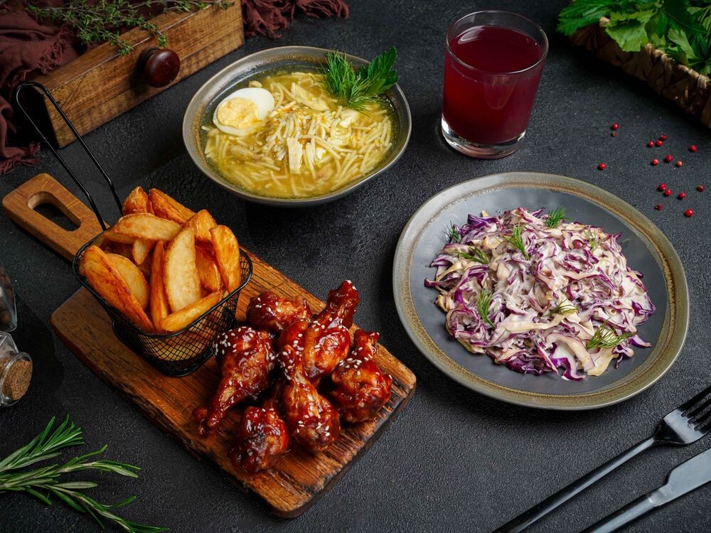 Лапша с курицей и яйцом ,Крылья BBq с картофелем по-деревенски ,капустный салат , морс на выбор, черный и белый хлеб