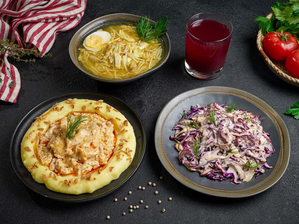 Лапша с яйцом и курицей ,фирменная курица по грузински в сливочном соусе с пюре ,салат капустный , морс на выбор, черный и белый хлеб
