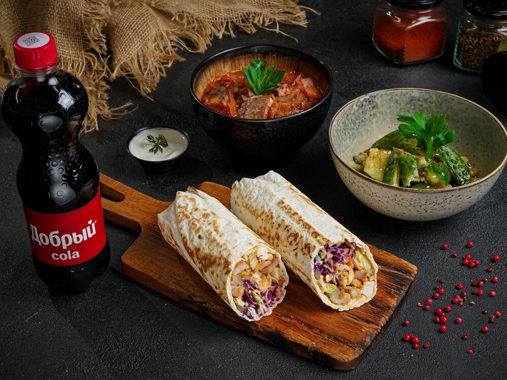 Борщ ,шаурма классическая ,салат из битых огурцов , кола добрый