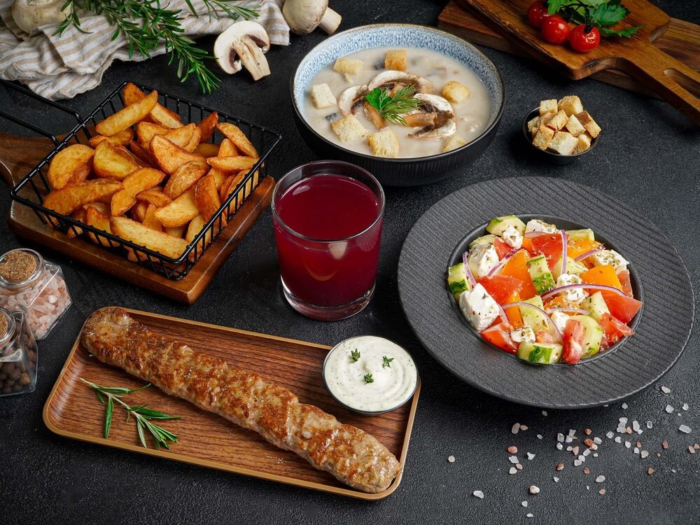 Грибной суп ,кебаб из баранины с картофелем по-деревенски ,греческий салат , фирменный красный соус, морс на выбор, черный и белый хлеб