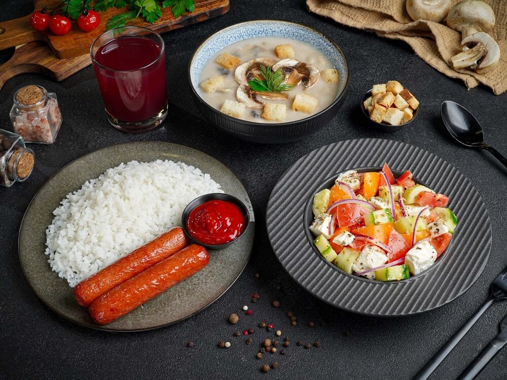 Грибной суп пюре ,две сосиски с рисом ,салат греческий , фирменный белый соус, морс на выбор, черный и белый хлеб