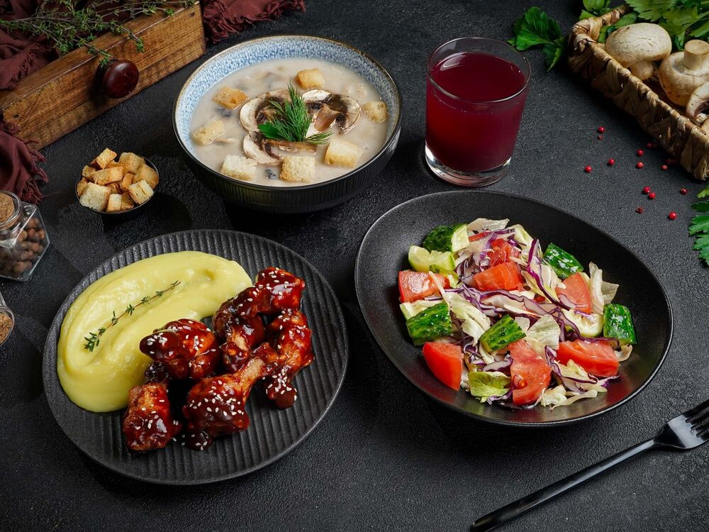 Грибной суп пюре ,Крылья BBq с пюре ,овощной салат , морс на выбор, черный и белый хлеб