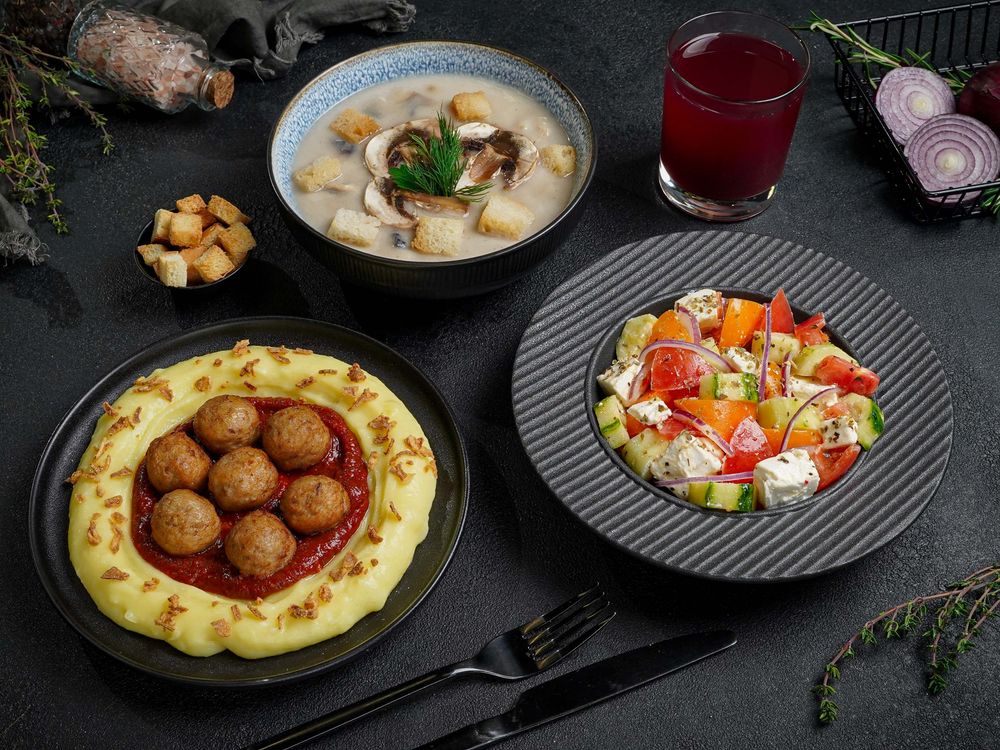 Грибной суп-пюре ,фрикадельки с пюре ,салат греческий , фирменный красный соус, морс на выбор, черный и белый хлеб