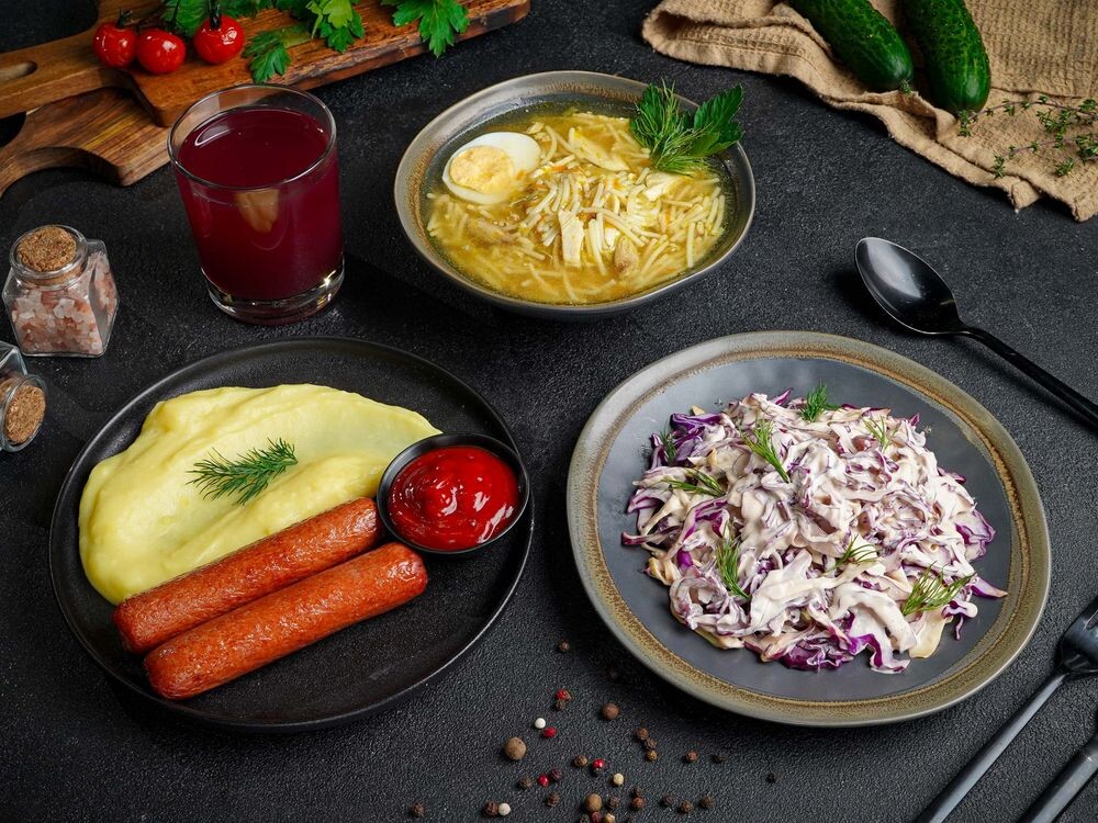 Лапша с курицей и яйцом ,две сосиски с пюре ,салат капустный , фирменный красный соус, морс на выбор, черный и белый хлеб