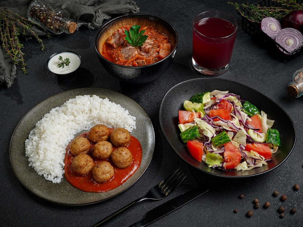 Борщ ,фрикадельки с рисом ,салат овощной , фирменный красный соус, морс на выбор, черный и белый хлеб