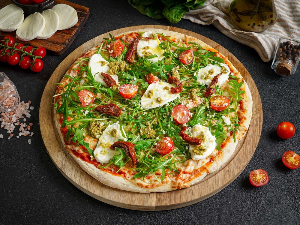 Фирменный белый соус , куриное филе , помидоры черри, сыр моцарелла, рукола, нежная моцарелла гальбани, пармезан