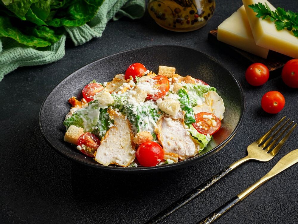 Классический салат Цезарь, который идеально сочетает в себе хрустящий салат Романо, сочную куриную грудку, спелые помидоры черри, пикантный сыр пармезан и ароматные гренки, политые фирменным соусом Цезарь с анчоусами и каперсами