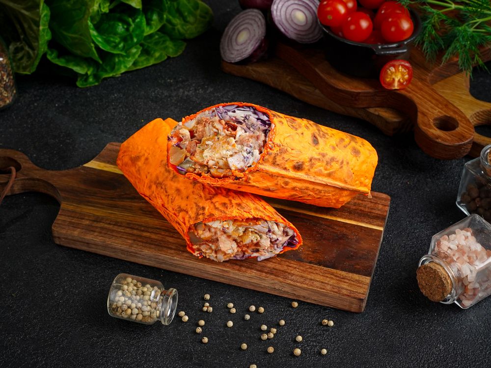 Куриное филе, лаваш, помидор, огурец маринованный, лук репчатый , чесночный соус, капуста, айсберг,томатный соус